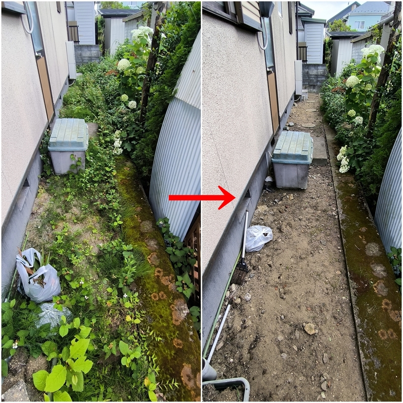 梅の木を伐採、敷地内の雑草を手刈りにて除草、
